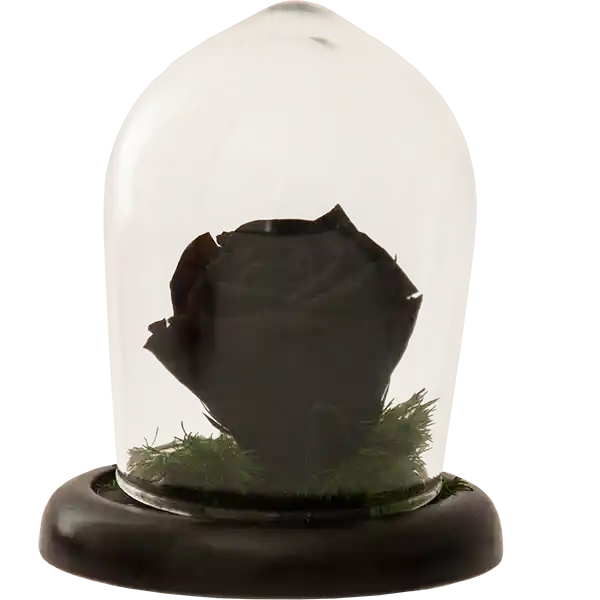 Arreglo floral con Urna de vidrio y base en madera color wengue, en su interior una cabeza de rosa estándar natural preservada, que perdura intacta por meses, sobre una base de follaje preservado. Viene en Bolsa de lujo e Incluye tarjeta.
