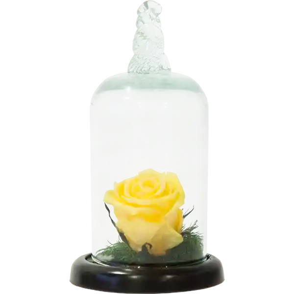 Arreglo floral con Urna de vidrio y base en madera color wengue, en su interior una cabeza de rosa estándar natural preservada, que perdura intacta por meses, sobre una base de follaje preservado. Viene en Bolsa de lujo e Incluye tarjeta.
