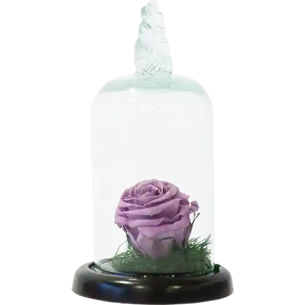 Arreglo floral con Urna de vidrio y base en madera color wengue, en su interior una cabeza de rosa estándar natural preservada, que perdura intacta por meses, sobre una base de follaje preservado. Viene en Bolsa de lujo e Incluye tarjeta.