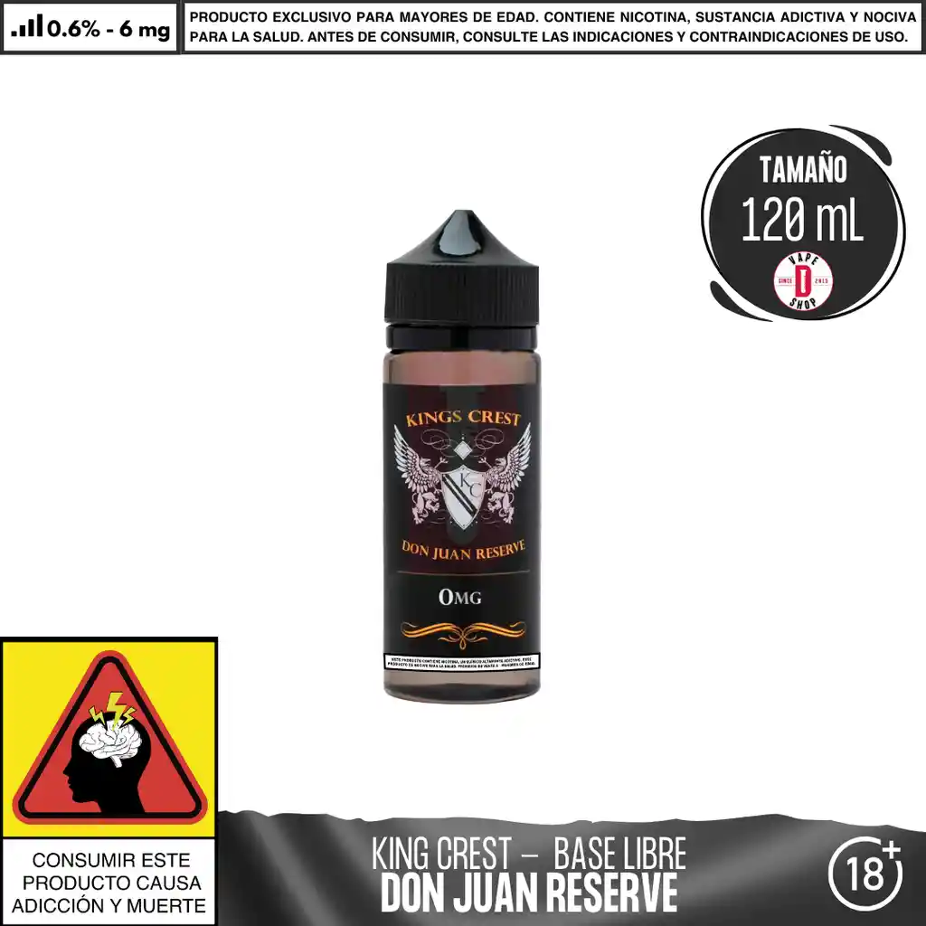 La versión de reserva del popular sabor de pastel de nuez de mantequilla Don Juan, Don Juan Reserve es un pastel de nuez de mantequilla de chocolate con costra de galletas Graham, cubierto con una cucharada de crema batida dulce. Presentación: Botella de 120ml 70VG/30PG La elaboración y fabricación de las sales de nicotina se realiza en Estados Unidos con ingredientes de la máxima calidad. ➽ La seguridad, calidad y confianza priman en éstos líquidos✭✭✭✭✭ Advertencia: Contiene nicotina, que puede ser venenoso. Evitar el contacto con la piel y los ojos. No ingerir. Mantener siempre en empaque original y en un ambiente fresco y seco. Mantener alejado de niños y mascotas. No debe utilizarse por Mujeres en estado de embarazo o personas con problemas de respiración como el asma. Prohibida la venta a menores de 18 años. En caso de accidente contacte a la línea 123. Ingredientes: Glicerina Vegetal (USP), Propilenglicol (USP), Nicotina (USP), Extractos de sabor de grado alimenticio.