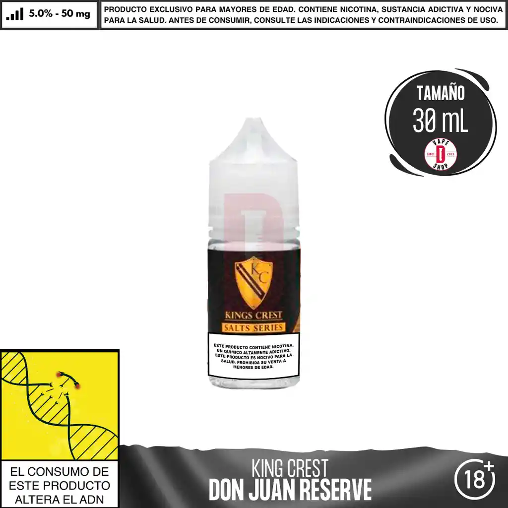 La versión de reserva del popular sabor de pastel de nuez de mantequilla Don Juan ahora en sales de nicotina, Don Juan Reserve de Kings Crest es un pastel de nuez de mantequilla de chocolate con costra de galletas Graham, cubierto con una cucharada de crema batida dulce. Sabores primarios: pastel de nuez, chocolate, galleta Graham, crema batida, reserva. Presentación: Botella de 30ml 50VG/50PG La elaboración y fabricación de las sales de nicotina se realiza en Estados Unidos con ingredientes de la máxima calidad. ➽ La seguridad, calidad y confianza priman en éstos líquidos✭✭✭✭✭ Advertencia: Contiene nicotina, que puede ser venenoso. Evitar el contacto con la piel y los ojos. No ingerir. Mantener siempre en empaque original y en un ambiente fresco y seco. Mantener alejado de niños y mascotas. No debe utilizarse por Mujeres en estado de embarazo o personas con problemas de respiración como el asma. Prohibida la venta a menores de 18 años. En caso de accidente contacte a la línea 123. Ingredientes: Glicerina Vegetal (USP), Propilenglicol (USP), Nicotina (USP), Extractos de sabor de grado alimenticio.