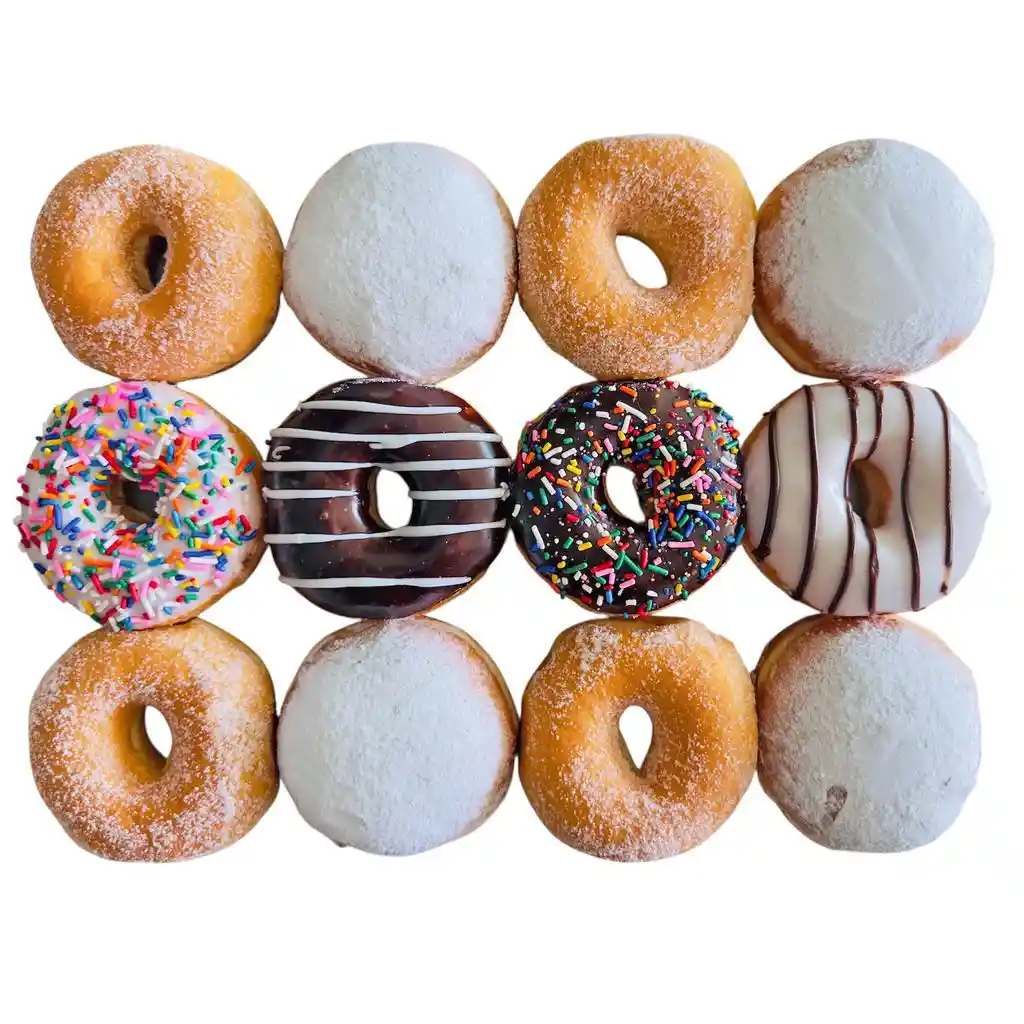 Sabores variados de donas que incluyen opciones glaseadas de vainilla y chocolate, decoradas con dulces de colores. También disponibles donas cubiertas de azúcar y versiones rellenas de fresa o arequipe | Peso Neto: 1.3 kg / 2.86 lb | Empaque en caja, fácil de llevar | El producto debe consumirse una vez abierto y antes de la fecha de vencimiento | Almacenar a temperatura ambiente | Elaborado en Colombia.