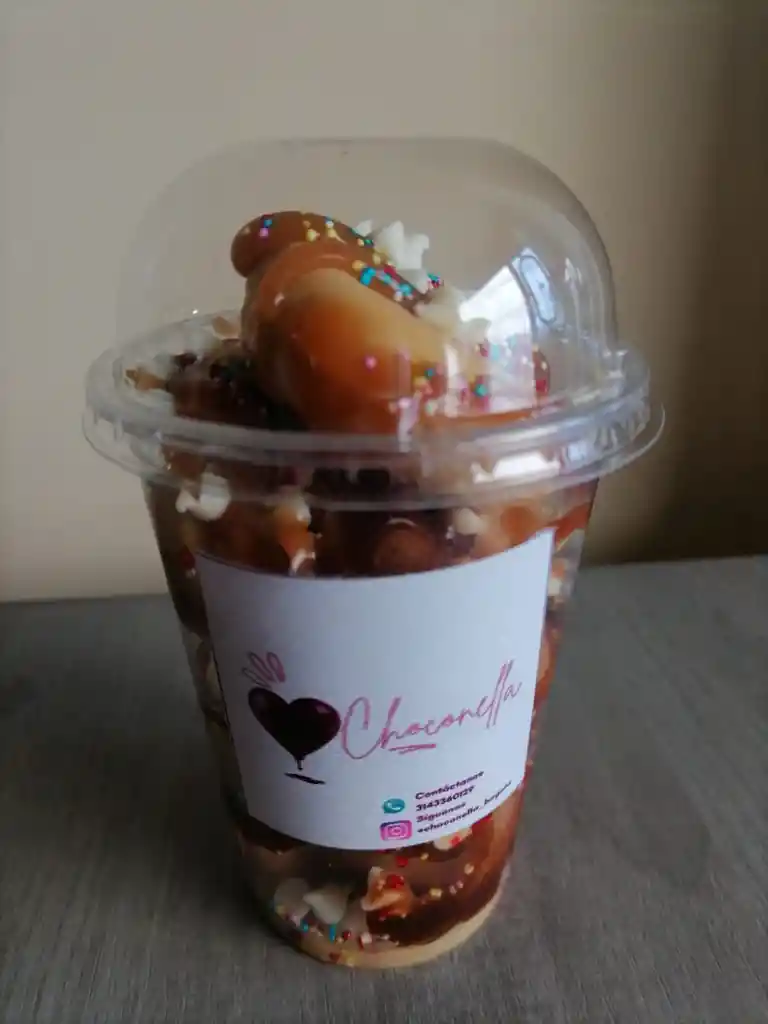 5 MINI DONITAS EN VASO, BAÑADAS CON SALSA DE CHOCOLATE, AREQUIPE Y LECHE CONDENSADA Y ADICIONADA CON GRAGEAS DE COLORES