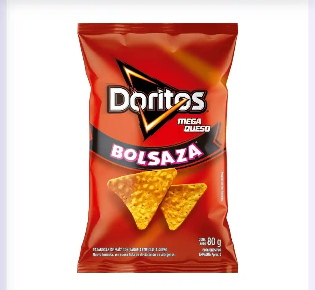 Doritos Mega Queso Bolsaza 80g: Chips de maíz sabor a queso intenso en presentación grande. El crunch perfecto para tus antojos.