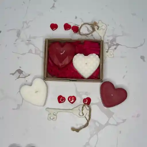 cajita con dos velas de soya en forma de corazón . estilos y colores sujetos a disponibilidad esta opción es ideal para compartir . regalo y detalle de san Valentin
