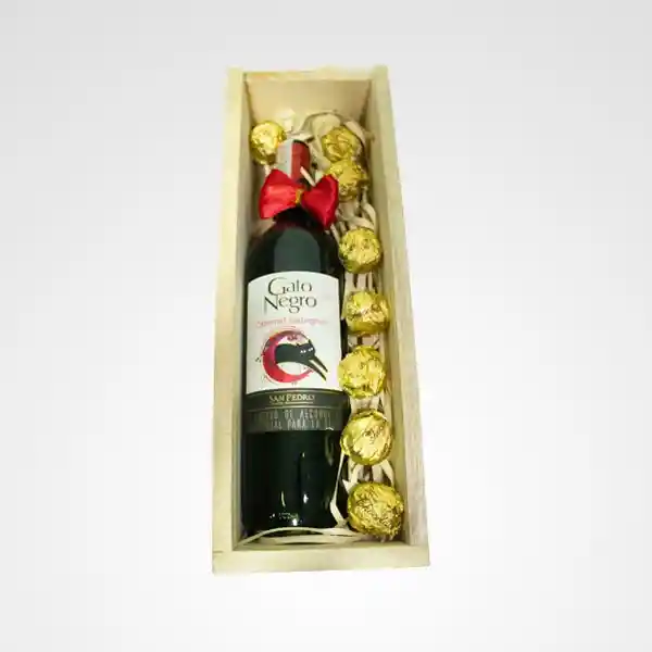 Caja De Madera Con Tapa Corrediza Compuesta De Botella De Vino Gato Negro 750 Ml Y 8 Chocolates Ferrero.. .. .