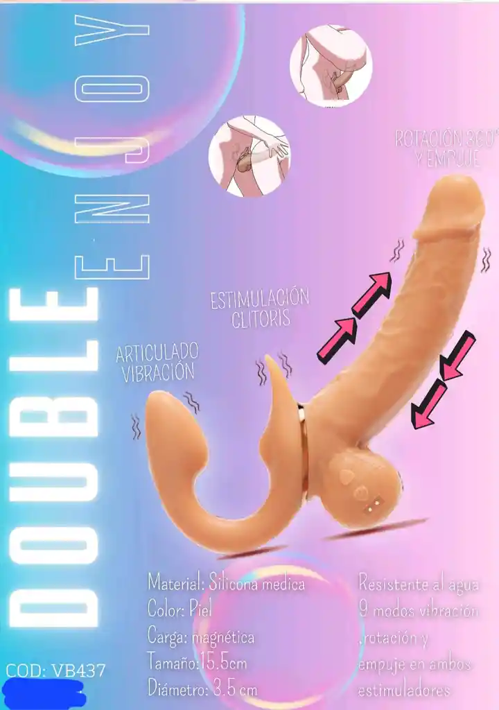 MATERIAL: Silicona Medica COLOR: Piel CARGA: Magnética TAMAÑO: 15.5cm DIAMETRO: 3.5cm Resistente al agua. 9 Modos de vibracion, rotacion y empuje en ambos estimuladores