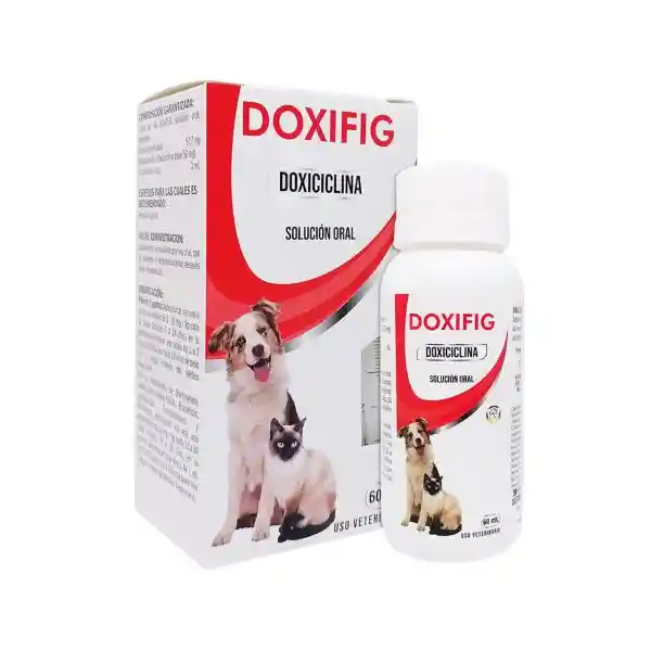Doxifig es una suspensión oral a base de doxiciclina, un antibiótico de amplio espectro, ideal para tratar una variedad de infecciones bacterianas en perros y gatos. Este medicamento es efectivo contra bacterias como Haemobartonella, Staphylococcus, Streptococcus, y muchas otras, siendo especialmente útil en el tratamiento de enfermedades como la Bartonelosis, Leptospirosis, Toxoplasmosis, y Erlichiosis. La doxiciclina es conocida por su capacidad de penetrar profundamente en los tejidos, lo que la hace efectiva en infecciones de difícil acceso.