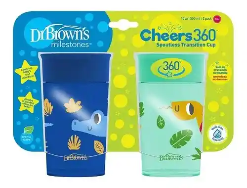 ¿Es hora de pasar al bebé a una taza de niño grande? Haz que su hito sea un éxito con la taza de Brown’s Milestones™ Cheers360™ Taza de transición sin boquilla Esta taza para beber de 360 grados permite que el bebé beba desde cualquier lado del borde, y la válvula de silicona transparente Sip-and-See permite al bebé ver el interior sin derrames, para un aprendizaje verdadero sin fugas. Su diseño de una sola pieza hace que la limpieza y el montaje sea fácil A medida que las habilidades de beber del bebé mejoran, simplemente retira la válvula y utilízala como una verdadera taza de niño grande. Sabrás cuándo es el momento de un recambio debido al material translúcido, no es necesario verificarlo. Viene con una tapa fácil de transportar. Al bebé le encantará las impresiones de animales juguetones, desde cocodrilo azul y perezoso rojo, hasta leopardo rosa y serpiente verde. Lavavajillas (bandeja superior). Sin bisfenol A. 10 oz, a partir de 9 meses Enseña habilidades de tomar como niño grande. ¿Es hora de pasar al bebé a una taza de niño grande? Haz que su hito sea un éxito con la taza de Dr. Brown's Milestones Cheers360: taza de transición sin boquilla Aprendizaje sin fugas. Esta taza para beber de 360 grados permite que el bebé beba desde cualquier lado del borde, y la válvula de silicona transparente Sip-and-See permite al bebé ver el interior sin derrames, para un aprendizaje verdadero sin fugas. Crece con el bebé. A medida que las habilidades de beber del bebé mejoran, simplemente retira la válvula y utilízala como una verdadera taza de niño grande. Fácil de limpiar. Lavavajillas (bandeja superior). Sin bisfenol A. Ve cuándo está vacío. Sabrás cuándo es el momento de un recambio debido al material translúcido, no es necesario verificarlo.