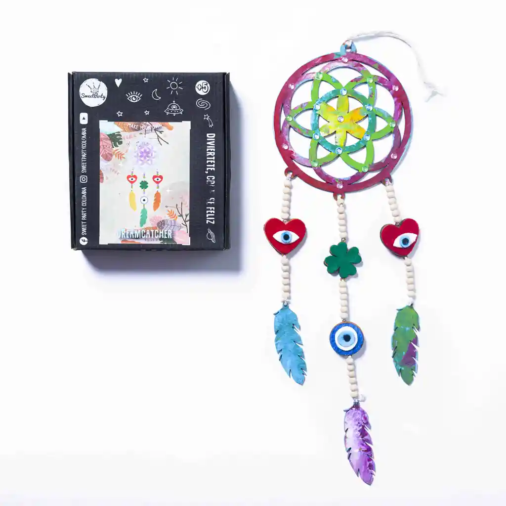 Con este kit podrás pintar, armar, ensartar, pegar, decorar y disfrutar de un hermoso atrapasueños que protegerá tus sueños en las noches! Incluye Base atrapasueños en madera Chaquiras Brillantes Pinturas Pincel de espuma Silicona líquida Piezas en tela Piezas en madera