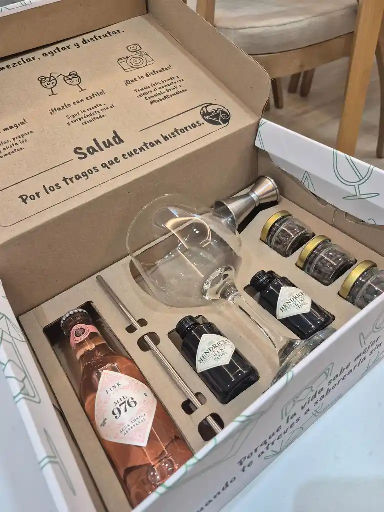 Una experiencia completa para preparar un Gin & Tonic como bartender (Caja regalo). Incluye: 2 mini botellas de ginebra Hendrick’s, 1 agua tónica artesanal, 3 frasquitos de botánicos (flor de jamaica, anís estrellado y pimienta dulce), 1 copa balón, 1 Jigger o medidor de onzas, 1 pitillo metálico, Receta del cóctel, tarjeta personalizada, Playlist Spotify