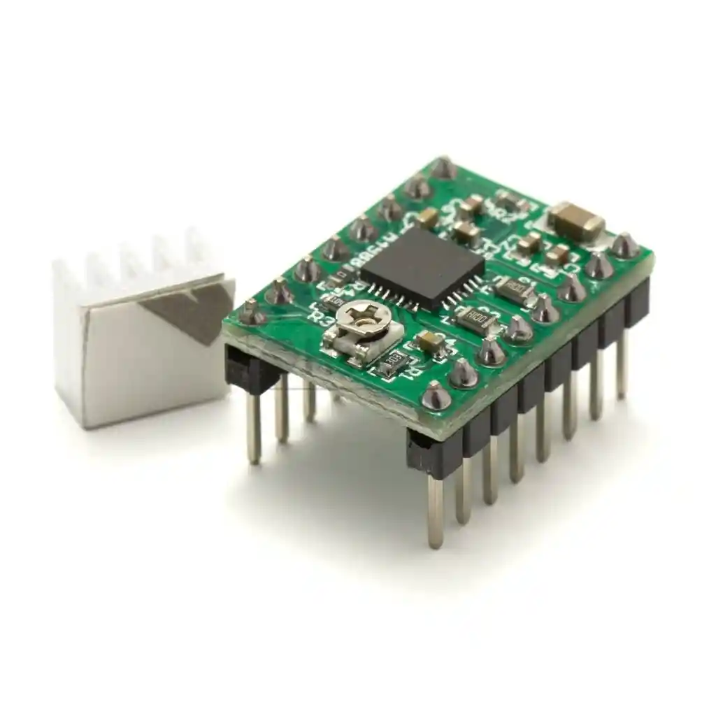 El driver para motor a pasos A4988 cuenta con ajuste de corriente, protección de sobre-corriente y sobre temperatura y 16 resoluciones de “micro-stepping” para lograr hasta 1/16 de paso. Opera en un rango de 8 a 35 volts y puede entregas hasta 1A por fase sin la necesidad de utilizar un disipador de calor o sistema de ventilación forzado. Se pueden lograr corrientes de hasta 2A utilizando disipadores de calor y ventiladores. Este producto es una tarjeta que porta el A4988 de Allegro Semiconductor, por lo que recomendamos encarecidamente a nuestros clientes leer la hoja de datos correspondiente al componente principal para entender su funcionamiento y limitantes del módulo. El Driver para motor a pasos A4988 resulta ideal para manejar motores a pasos bipolares de hasta 2 amperes por bobina de una manera sencilla mediante los pines digitales de un microcontrolador, siendo su principal aplicación maquinas CNC, impresoras 3D y robots. Voltaje de operación de 8 a 35 volts Máxima corriente por bobina: 2 Amperes Capacidad de “micro-stepping” Interfaz simple de 2 pines con el microcontrolador: Pines STEP y DIRECTION 5 Diferentes resoluciones: Paso completo, 1/2 de paso, 1/4 de paso, 1/8 de paso y 1/16 de paso. Control de corriente ajustable mediante un potenciómetro en el módulo Protección por sobre-temperatura, bajo voltaje, corto y otras condiciones de error comunes LA COMPRA INCLUYE: 1x DRIVER A4988