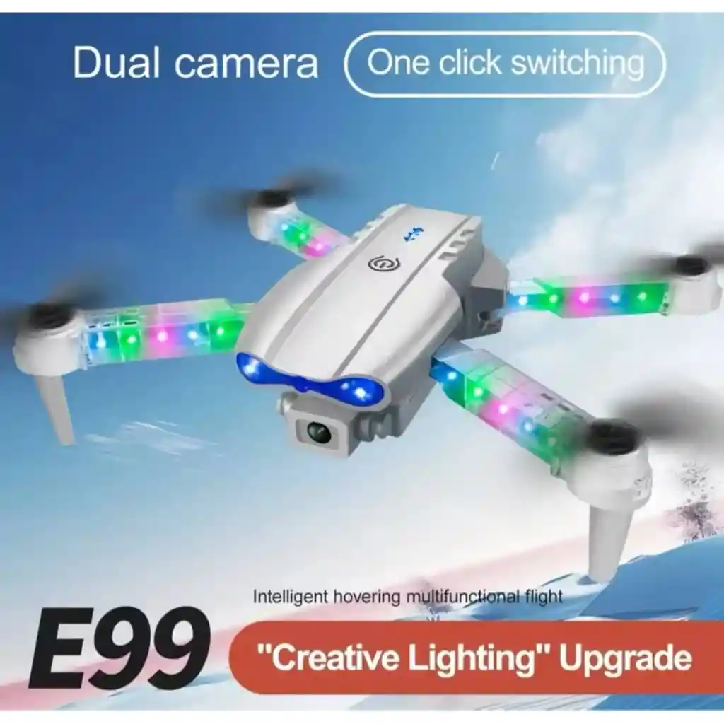 Dron E99 Pro Max 3 Baterías Estuche Multifuncional Dron Plegable con Doble Cámara y Luces LED – Tecnología y Diversión Aérea ¡Vive la experiencia de vuelo definitiva con este dron plegable de doble cámara! Ideal para capturar fotos y videos impresionantes, ya sea para fotografía aérea, exploración o entretenimiento. Características destacadas: Doble Cámara HD: Captura imágenes nítidas desde diferentes ángulos con su cámara frontal de 2MP y cámara de flujo óptico. Transmisión en Tiempo Real: Controla y visualiza en tu smartphone con la app WiFi compatible con Android e iOS. Diseño Plegable y Portátil: Compacto y fácil de transportar, perfecto para llevar a cualquier aventura. Modo Trayectoria y Vuelo Estable: Dibuja rutas desde la app y el dron seguirá el recorrido de forma precisa gracias al giroscopio de 6 ejes. Batería de Larga Duración: Incluye batería recargable de 900mAh con hasta 10 minutos de vuelo. Luces LED: Perfecto para vuelos nocturnos y mayor visibilidad. Especificaciones Técnicas: Frecuencia: 2.4 GHz | Canal: 4CH Tamaño Plegado: 17 x 14.5 x 6 cm | Desplegado: 28 x 28 x 6 cm Peso: 500 g | Distancia de Vuelo: 100 metros Tiempo de Vuelo: 8-10 min | Tiempo de Carga: 80-100 min Incluye Protectores de Hélices y Cable USB Funciones Adicionales: Despegue y aterrizaje con un botón Modo sin cabeza y vuelo de trayectoria Rotación 3D y detección de gravedad ¡Eleva tu diversión y captura cada momento con este dron de última generación!