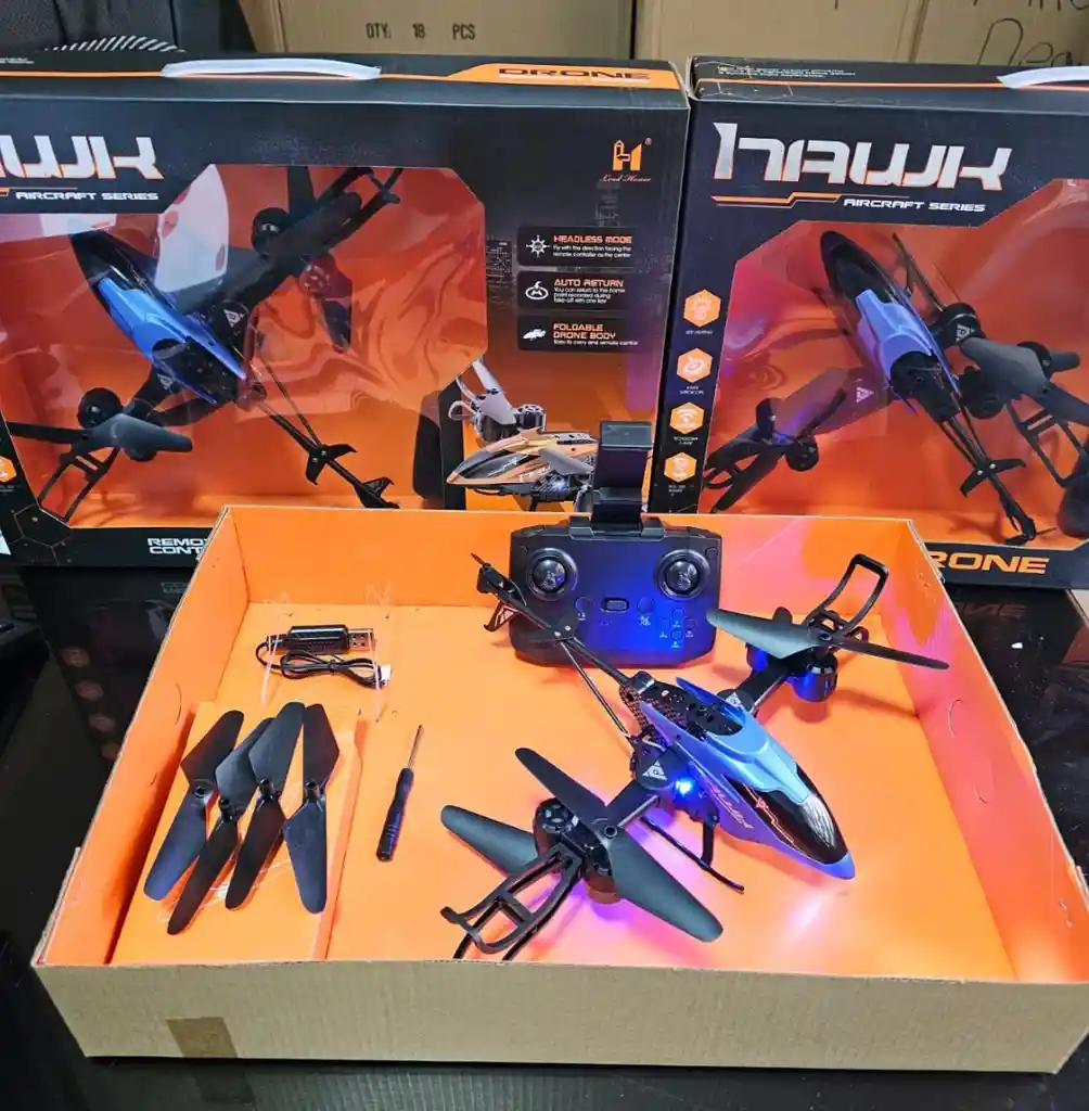 Drone Helicóptero HAWK con Control Remoto Vive una experiencia de vuelo increíble con este Drone HAWK, diseñado para ofrecerte estabilidad, potencia y diversión al máximo nivel. Ideal tanto para principiantes como para pilotos más experimentados. Características principales: Modo sin cabeza (Headless Mode): facilita el control del dron sin preocuparte por la dirección del vuelo. Función de retorno automático: el dron regresa fácilmente al punto de partida con solo presionar un botón. Cuerpo plegable: diseño compacto y práctico para transportar y guardar. Control remoto ergonómico: con soporte para celular y mandos de alta precisión. Batería recargable vía USB: incluye cable de carga. Luces LED integradas: para vuelos nocturnos con estilo y visibilidad. Incluye: 1 Drone HAWK 1 Control remoto 1 Cable USB de carga Hélices de repuesto y herramienta Manual de instrucciones Tamaño aproximado del dron: 34 cm de largo x 30 cm de ancho Perfecto para regalos, recreación al aire libre o practicar maniobras aéreas. Despega y disfruta la emoción del vuelo con el potente HAWK Drone.