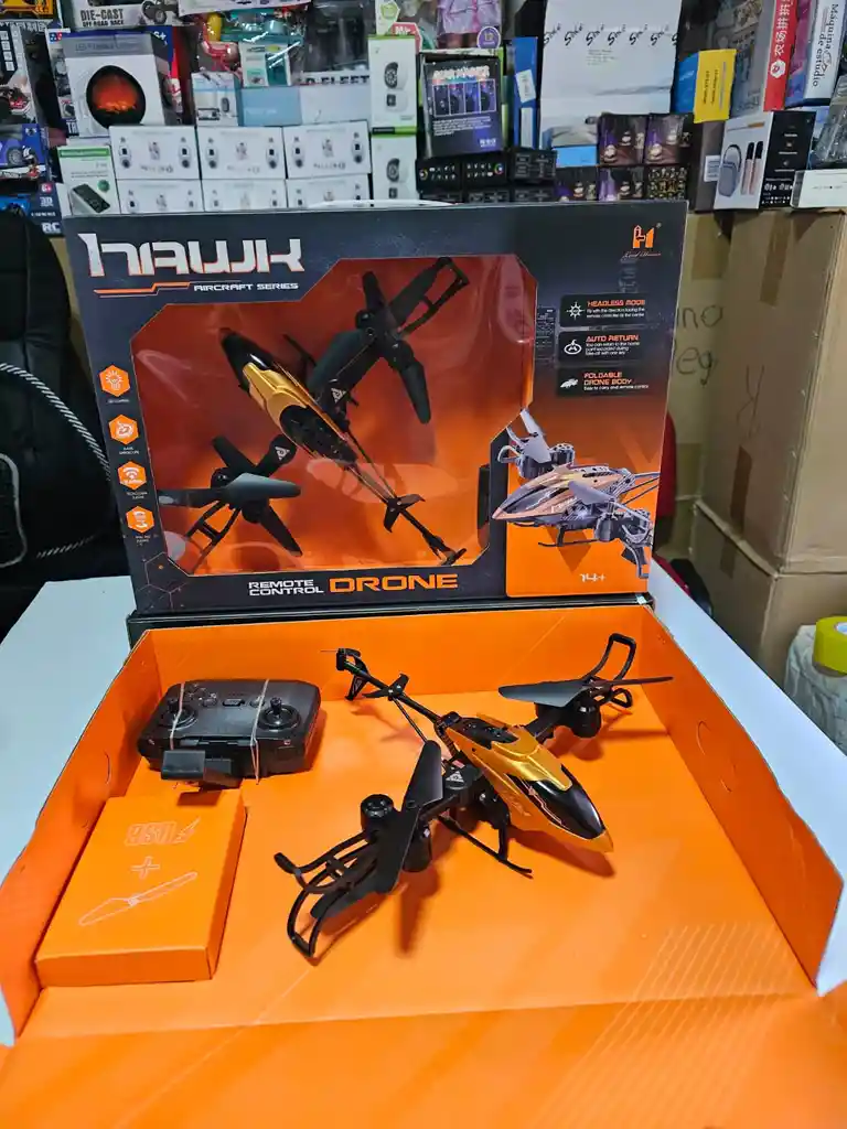 🚁 **Drone Helicóptero HAWK con Control Remoto** 🚁 Vive una experiencia de vuelo increíble con este **Drone HAWK**, diseñado para ofrecerte estabilidad, potencia y diversión al máximo nivel. Ideal tanto para principiantes como para pilotos más experimentados. ✨ **Características principales:** * 🔁 **Modo sin cabeza (Headless Mode):** facilita el control del dron sin preocuparte por la dirección del vuelo. * 🔙 **Función de retorno automático:** el dron regresa fácilmente al punto de partida con solo presionar un botón. * 🔧 **Cuerpo plegable:** diseño compacto y práctico para transportar y guardar. * 🎮 **Control remoto ergonómico:** con soporte para celular y mandos de alta precisión. * ⚡ **Batería recargable vía USB:** incluye cable de carga. * 💡 **Luces LED integradas:** para vuelos nocturnos con estilo y visibilidad. 📦 **Incluye:** * 1 Drone HAWK * 1 Control remoto * 1 Cable USB de carga * Manual de instrucciones 📏 **Tamaño aproximado del dron:** 34 cm de largo x 30 cm de ancho Perfecto para regalos, recreación al aire libre o practicar maniobras aéreas. ¡Despega y disfruta la emoción del vuelo con el potente HAWK Drone! 🦅