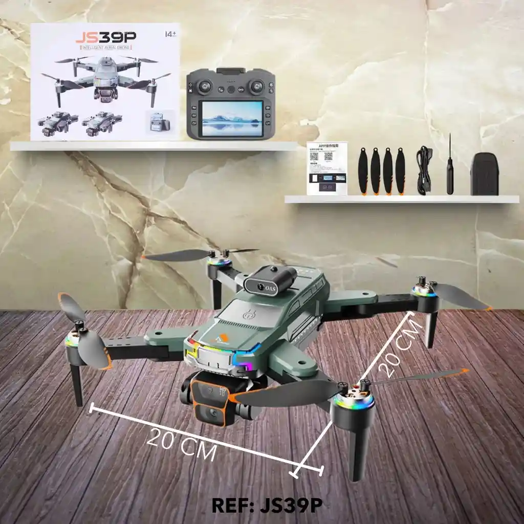 *💥 DRONE AÉREO INTELIGENTE CON CONTROL Y PANTALLA 💥* *• FUNCIÓN:* Vehículo aéreo no tripulado (VANT) de alta gama, diseñado para vuelo con características inteligentes (Intelligent Aerial Drone). Ideal para filmación y fotografía aérea, ya que su control remoto incluye una pantalla integrada. *• CARACTERÍSTICAS:* • Diseño: Drone de cuerpo robusto y elegante en color Verde/Gris (como el modelo principal) y, según la información adicional, Negro. Presenta detalles naranjas en las hélices y el cuerpo. • Control Remoto: Incluye un control avanzado con una pantalla LCD integrada para monitorear el vuelo y la cámara. • Accesorios: Incluye hélices de repuesto, manual de usuario, herramientas y una batería externa. • Edad Recomendada: Apto para mayores de 14 años (14+). *• Colores Disponibles:* Negro y Verde/Gris. *• MEDIDAS:* 20 CM de largo x 20 CM de ancho. *• REFERENCIA: JS39P.*