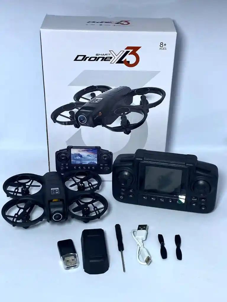 *Drone YL3* • Control remoto con pantalla • Foto y video • Resistencia al choque • Despegue y aterrizaje con un solo clic • Círculo de protección • Transferencia de imágenes de cámara cinematográfica • Transmisión de datos • Batería 10-15 aprox.