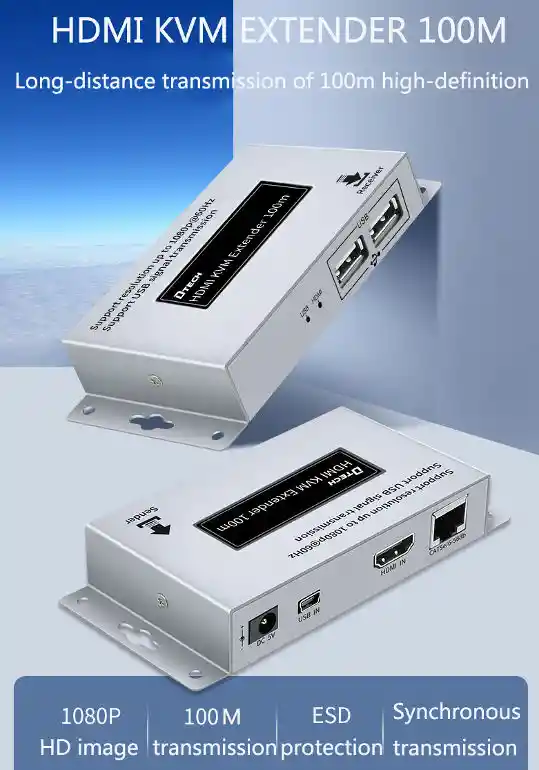Introducción del producto El extensor KVM consta de un transmisor y un receptor. Señal de audio y video sin comprimir transmitida a través de cable CAT5E/6, también proporciona protección para contenido digital de banda ancha, evita que el video se copie sin autorización. El extensor KVM es ampliamente utilizado en sistemas CCTV, sistemas de enseñanza, pantallas multimedia de alta calidad, videoconferencias, cine en casa digital, exposiciones, educación, finanzas, investigación científica, meteorología y otros campos. Conexión 1.Conecte el remitente al dispositivo fuente de señal con un cable HDMI;