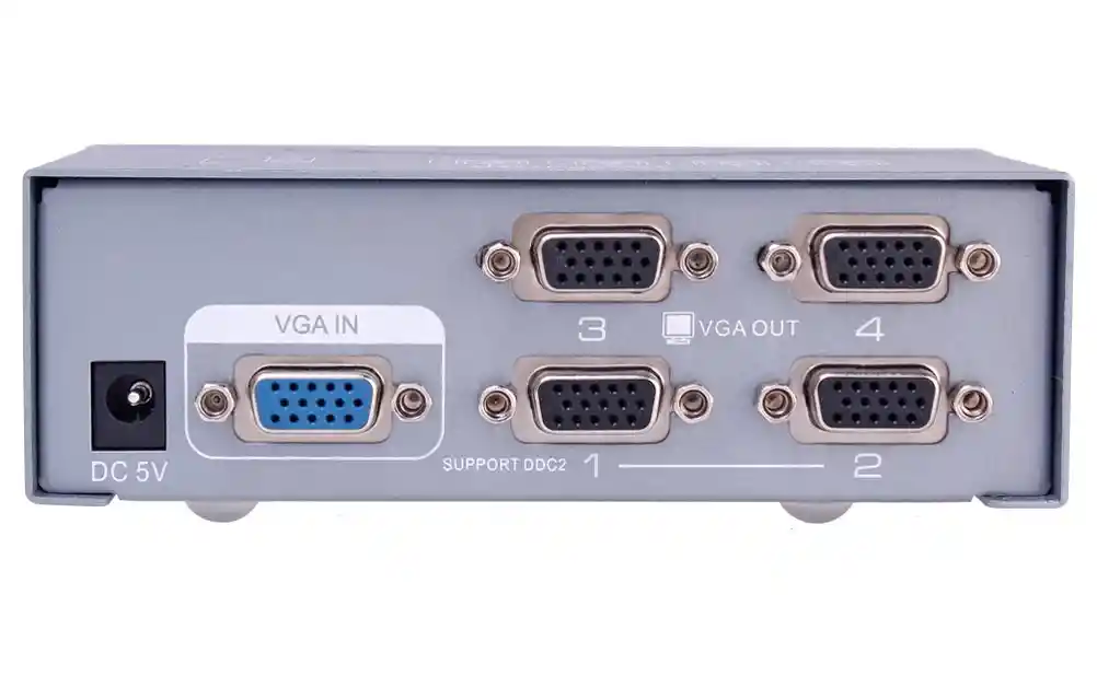 La caja de distribución de video VGA de 4 puertos copia una sola señal de fuente de video y la divide en múltiples monitores VGA (visualización simultánea con la misma imagen) El ancho de banda de 250 MHz admite una calidad de video superior y mantiene la mayor intensidad de señal en todas las aplicaciones con una resolución de hasta 1920 x 1080 a 60 Hz (Full HD 1080p) El divisor de monitor VGA alimentado extiende la distancia de transmisión hasta 40 m (130 pies) usando un cable VGA estándar (el adaptador de corriente está incluido) El diseño delgado ahorra espacio en el escritorio y la carcasa totalmente metálica para una máxima durabilidad y confiabilidad Se pueden conectar varios monitores conectando en cascada hasta 3 niveles de divisores de puertos VGA juntos, lo que lo hace ideal para aplicaciones de señalización digital en escuelas, iglesias, exhibiciones minoristas, presentaciones en ferias comerciales y más (admite video SVGA, VGA, XGA, UXGA)