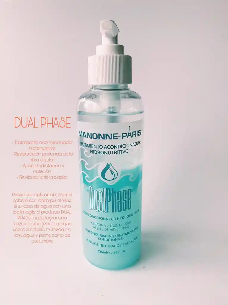 DUAL PHASE TRATAMIENTO ACONDICIONADOR HIDRONUTRITIVO Tratamiento dual que nutre, hidrata y acondiciona las capas externas y profundas del cabello, procesos necesarios para revitalizarlo. FASE LÍQUIDA: Complejo Proteínico que penetra en el cabello restaurando la humedad, elasticidad, estabilidad y equilibrio naturales. FASE CREMOSA: Complejo acondicionador que actúa sobre las capas externas del cabello desenredándolo instantáneamente, reparando las puntas abiertas y proporcionando un aspecto sedoso y brillante. MODO DE EMPLEO: Previo a la aplicación del producto lavar el cabello con el Champú-Crema de la línea Oil Repair Therapy de Manonne-Paris, elimine el exceso de agua con una toalla, agite el Dual Phase hasta lograr una mezcla homogénea, y aplique sobre el cabello húmedo, no enjuague y peine como de costumbre. Presentación: 235ml