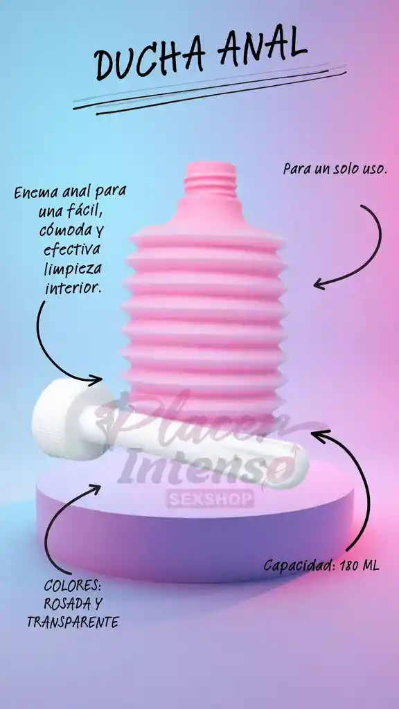 Enema anal para una fácil, cómoda y efectiva limpieza interior. Para un solo uso. CARACTERÍSTICAS: Capacidad: 180 ML COLORES: ROSADA Y TRANSPARENTE