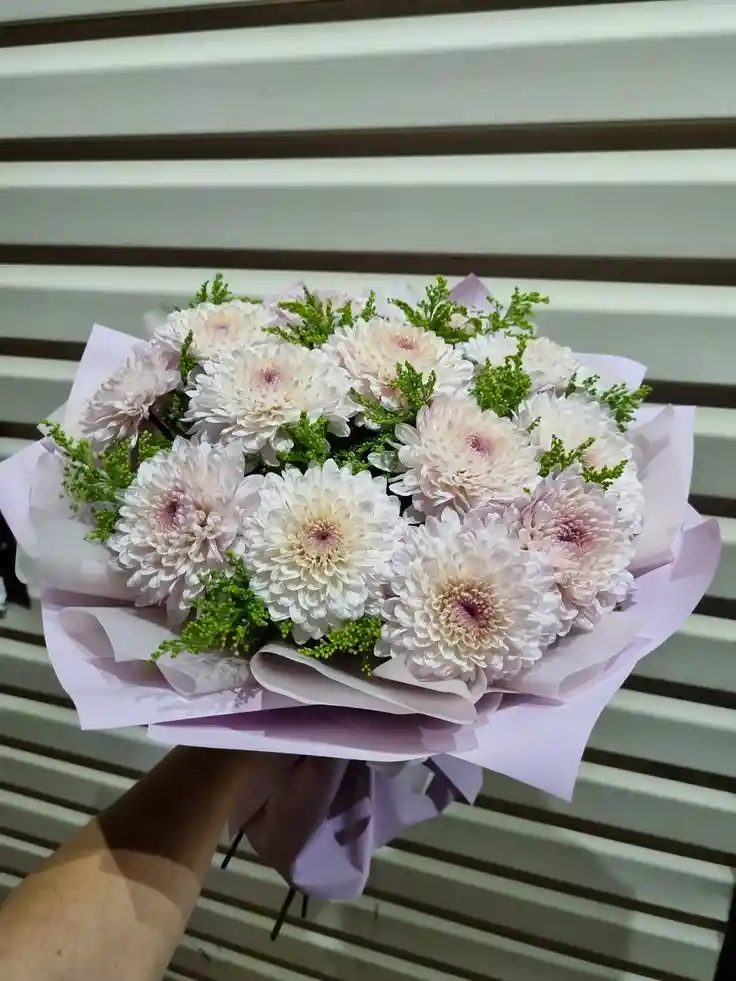 Un encantador bouquet de crisantemos en suaves tonos perla rosado y lavanda, realzado con toques verdes de follaje fresco y envuelto en papeles delicados color lavanda. Este diseño evoca calma, inocencia y frescura, ideal para regalar en momentos de agradecimiento, bienvenida o simplemente para iluminar el día de alguien especial.