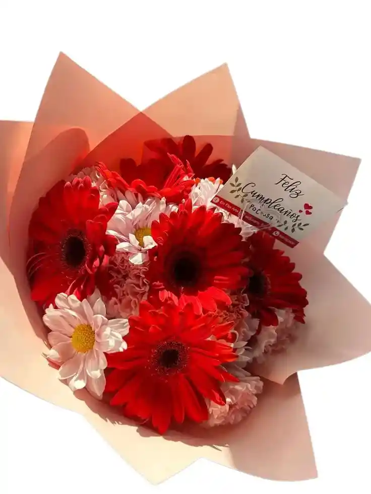 Bouquet de 6 gérberas rojas y 1 paquete de margaritas blancas Nota: La flor puede ser sustituida dependiendo la disponibilidad de color y del producto “Mensaje Personalizado” máximo de 30 caracteres (Dejar el mensaje en el chat, los comentarios no se previsualizan para la tienda por lo que si se dejan allí no podrá ser incluido).