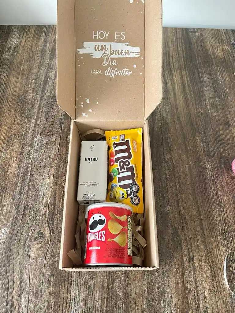 Dulce Box incluye: 1 Té Hatsu 200ml (sabor a disponibilidad), 1 paquete de M&M's (43.8g), 1 Papas Pringles (37g). Caja, Papel picado, moño y tarjeta con mensaje. La caja se envia en una bolsa sellada con sticker alusivo a la celebración. Tarjetas disponibles: Cumpleaños,Amor, Feliz Dia, Feliz dia Mujer, Feliz dia hombre, Mamá, Papá.