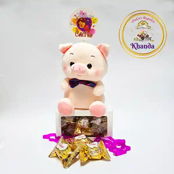 Dulce Cerdito, contiene: 1 Peluche Cerdito Pequeño (Peluche Cerdito Pequeño de Color Rosa dimensiones 25 cm (Aprox)) - 5 Bombon Chocolate Felicci (Chocolate Felicci está elaborado con los ingredientes más finos y ofrece un sabor suave y delicioso que te hará desear cada bocado.) - 1 Pin Pequeño Redondo Mensajes Variado (FR) (Pines Pequeños Redondos de Regalo con Mensajes Variados Por Unidad.) + Caja Nido Blanca