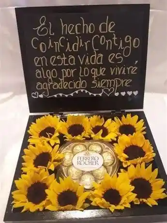 Incluye: caja de chocolater ferrero rocher x8 en corazon, girasoles x10, decoracion y mensaje personalizado