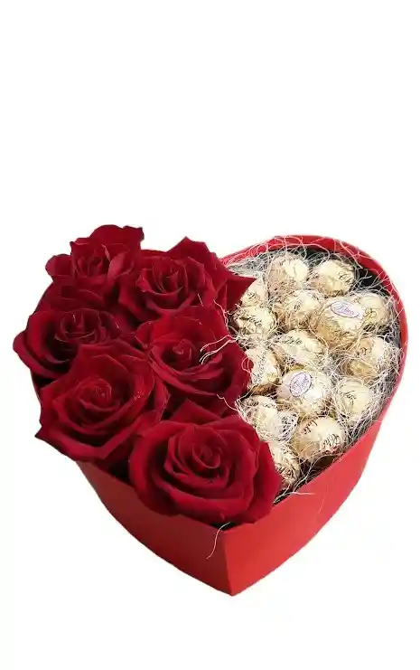 Arregló floral en caja de corazón, contiene 6 rosas y 15 chocolates tipo ferrero.