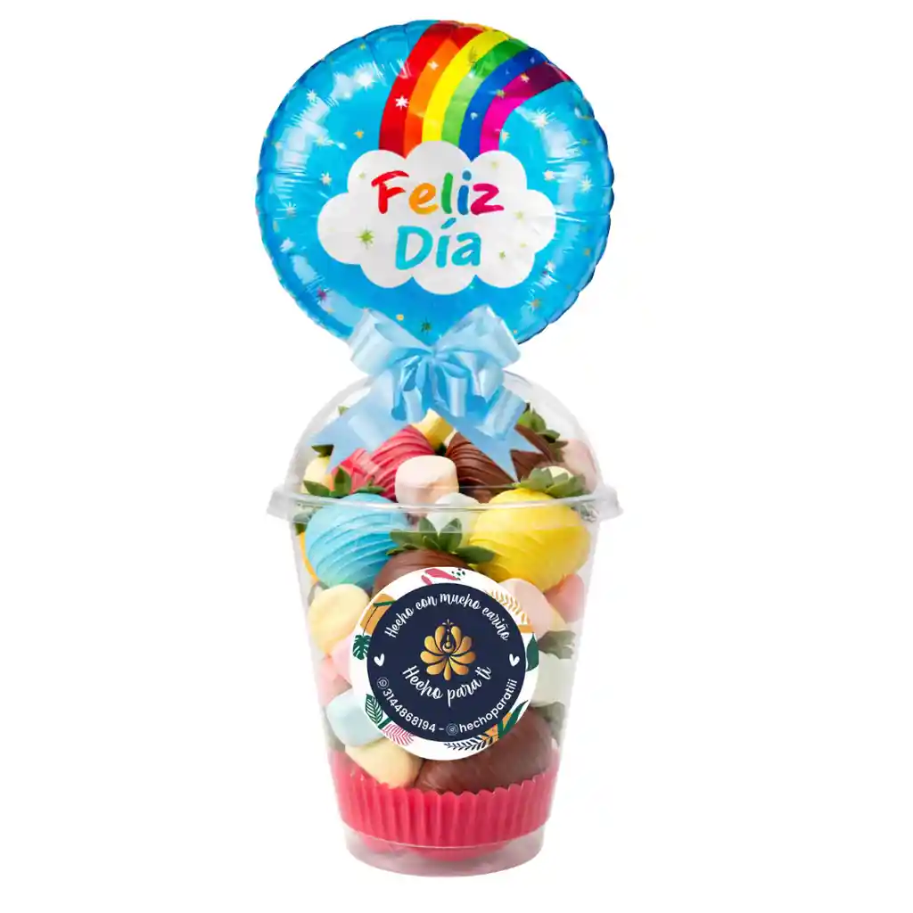 Un detalle lleno de color y alegría para celebrar el Día del Niño. Incluye 5 fresas frescas cubiertas con chocolate en tonos surtidos, acompañadas de suaves masmelos dentro de un vaso decorativo con globo. Perfecto para sorprender con un regalo dulce, divertido y especial. 🎈🍫