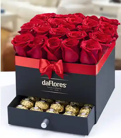 Dale una grata sorpresa a esa persona especial obsequiándole esta espectacular combinación de 25 rosas rojas y 8 Ferreros Rocher que resultará sin duda irresistible para sus ojos y su paladar. Todo empacado en una caja con un elegante diseño en color negro.
