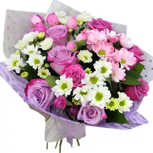 Bouquet floral en tonos rosados y lilas con detalles blancos, elaborado con flores frescas de alta calidad y diseño profesional armonioso. Algunas flores pueden variar sutilmente según la temporada, manteniendo siempre la frescura, el estilo y el valor del arreglo. Incluye tarjeta personalizada sin costo para acompañar tu mensaje especial.