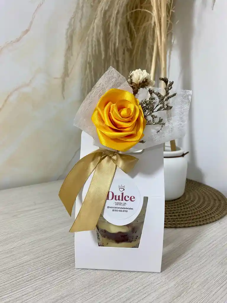 Hermosa cajita tipo bolsa con exquisito Postre Premium según disponibilidad y Flor Amarilla artesanal en tela decorada, tarjeta "21 de Marzo".