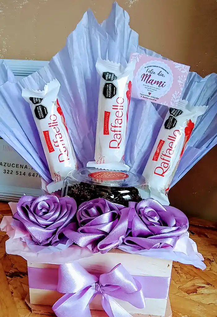 Ancheta dulce Violeta, contiene: Caja de madera decorada, tres rosas eternas, torta de chocolate, 3 paquetes de bombones rafaello y tarjeta. Especial para el día de la madre día del maestro día de la enfermera cumpleaños