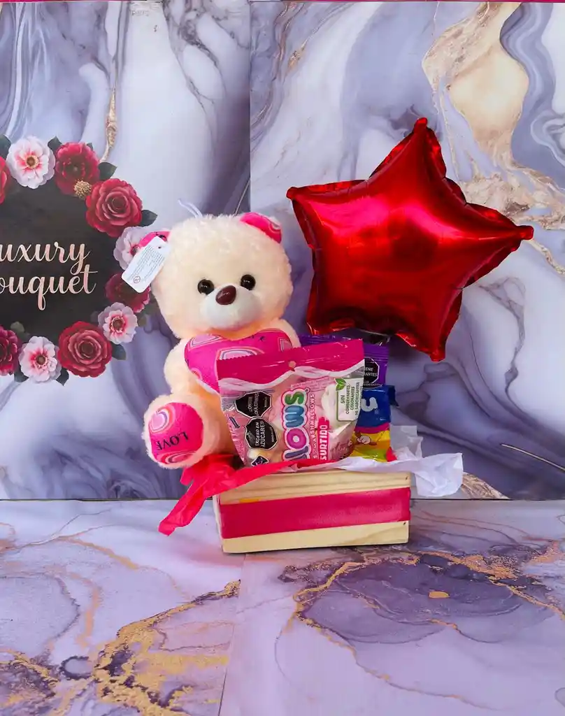 caja de madera con dulces y un adorable peluche a disposición