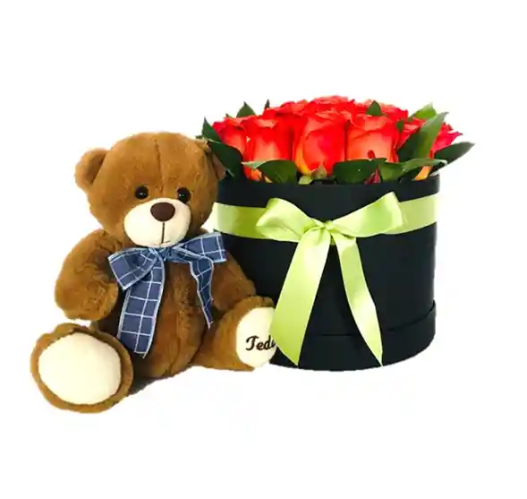 Caja de Lujo redonda con 25 rosas tipo exportación y oso de peluche. Rojo, Amarillo, Naranja, Rosado