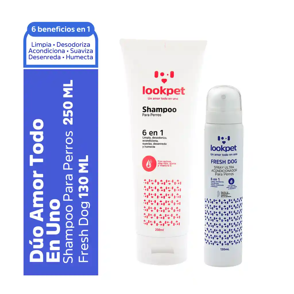 Dúo Amor Todo en Uno Lookpet: rutina diaria para mantener el pelaje limpio, suave y fácil de manejar en cualquier raza. Incluye Shampoo 6 en 1 Todas las Razas Lookpet (limpia profundamente, hidrata y realza el brillo natural pH balanceado y control de olor) y Fresh Dog Spray Ultra Acondicionador 6 en 1 (desenreda al instante, nutre y deja una suavidad sedosa sin enjuague, facilitando el cepillado y protegiendo el pelaje entre baños). Ideal para convertir el baño y el cepillado en un ritual de cuidado premium con presencia impecable todos los días. Un amor todo en uno.