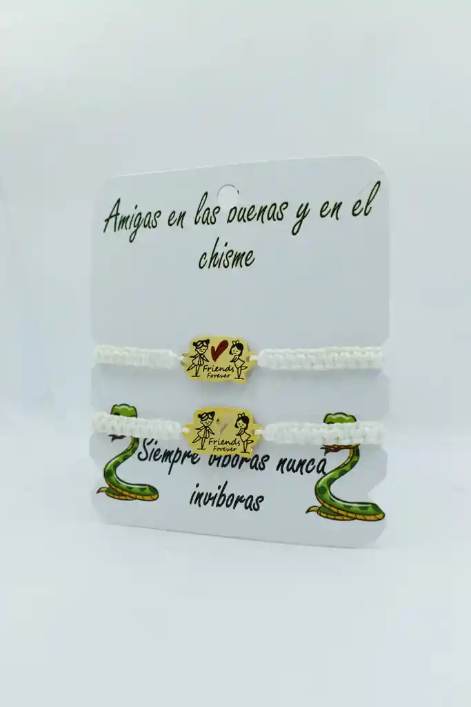 HERMOSO DUO DE MANILLAS DE COLOR BLANCO ACOMPAÑADO DE DOS AMIGAS, ELABORADAS CON HILO Y ORO GOLFIELD, PERFECTA PARA COMPARTIRLAS CON TU AMIGA
