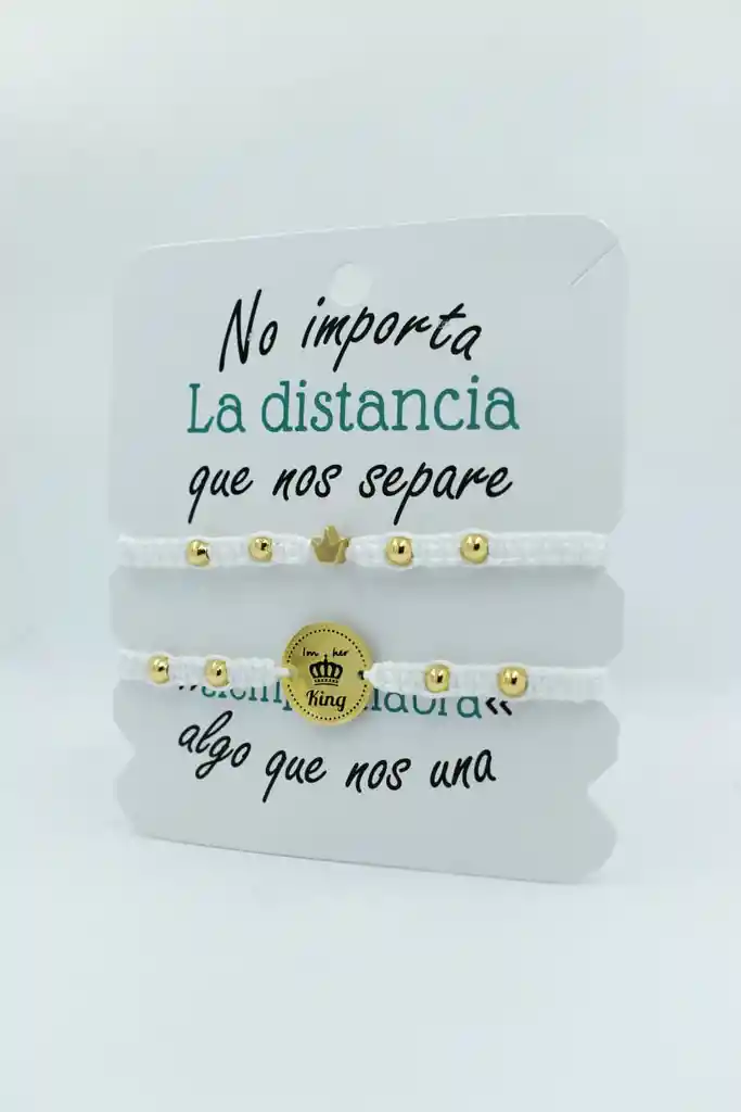 HERMOSO DUO DE MANILLAS DE COLOR BLANCO ACOMPAÑADO DE UNA MEDALLITA DE REY Y UNA CORONA, ELABORADAS CON HILO Y ORO GOLFIELD, PERFECTA PARA COMPARTIRLAS CON TU PAREJA