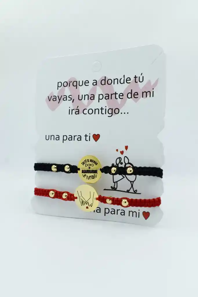 HERMOSO DUO DE MANILLAS DE COLOR ROJO Y NEGRO ACOMPAÑADO DE UNA MEDALLITA CON UNA PROMESA Y UNA FRASE, ELABORADAS CON HILO Y ORO GOLFIELD, PERFECTA PARA COMPARTIRLAS CON TU PAREJA