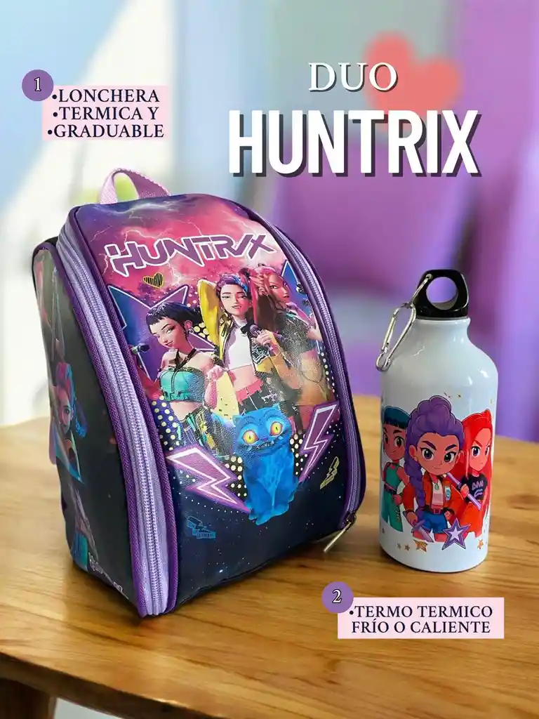 *DUO HUNTRIX 💜* Nuevo Duo escolar para tu niña 👧🏼 *INCLUYE* *LONCHERA HUNTRIX* •Diseños Guerreras k pop •Termica por dentro •Cuerdas graduables •Agarre de mano •Facil de limpiar *Medida:* 25Cm x 17Cm x 14Cm *TERMO TÉRMICO* •Tapa rosca •Diseño Sublimado •Con llavero •Temperatura frio o caliente *Capacidad:* 450Prox *Material:* acero