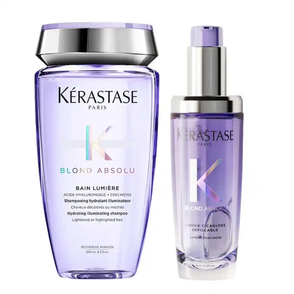 Blond Absolu es la respuesta definitiva para todas las rubias.. Una combinación única de potente Ácido Hialurónico y flor de Edelweiss que deja la fibra profundamente nutrida, atenúa los tonos amarillentos e ilumina el cabello para conseguir el rubio deseado. Shampoo: 250ml Oleo: 75ml