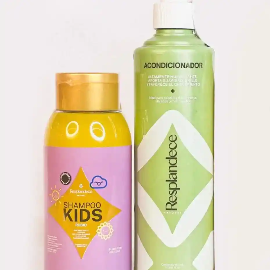 Shampoo + más Acondicionador. El combo ideal para obtener el color y la suavidad soñada en el delicado cabello de los niños. El shampoo mantiene el tono rubio de tu cabello de tu niño o niña. Contiene uva ( antioxidante y nutritivo), mango ( hidratante y reparador). Estimula el crecimiento, hidrata nutrición, gracias a las propiedades de sus ingredientes naturales como el Girasol (aclara y protege el color del cabello rubio contra los rayos UV), Manzanilla (aclara el cabello, evita exceso de grasa y caspa). NO contiene sal, ni parabenos Cruelty Free Producto Natural Es complemento ideal del tónico natural rubio de Resplandece Natural. El acondicionador aporta protección color rubio o cobrizo para un cabello saludable (tinturado o natural). Contiene Aceite de Girasol, Sacha Inchi, Karité y banano. Estimula el crecimiento, da brillo y nutrición, gracias a las propiedades de sus ingredientes naturales: Girasol (aclara y protege el color del cabello rubio contra los rayos UV), Gingo Biloba (reduce la caída del cabello), Ginseng (fortalece la fibra capilar, Manzanilla (aclara el cabello, evita exceso de grasa y caspa), Cebolla Cabezona (acelera el proceso de crecimiento del cabello y da brillo), Aloe Vera (hidrata y nutre el cabello). NO contiene sal, ni parabenos Cruelty Free Producto Natural Es complemento ideal del tónico natural rubio y cobrizo de Resplandece Natural.