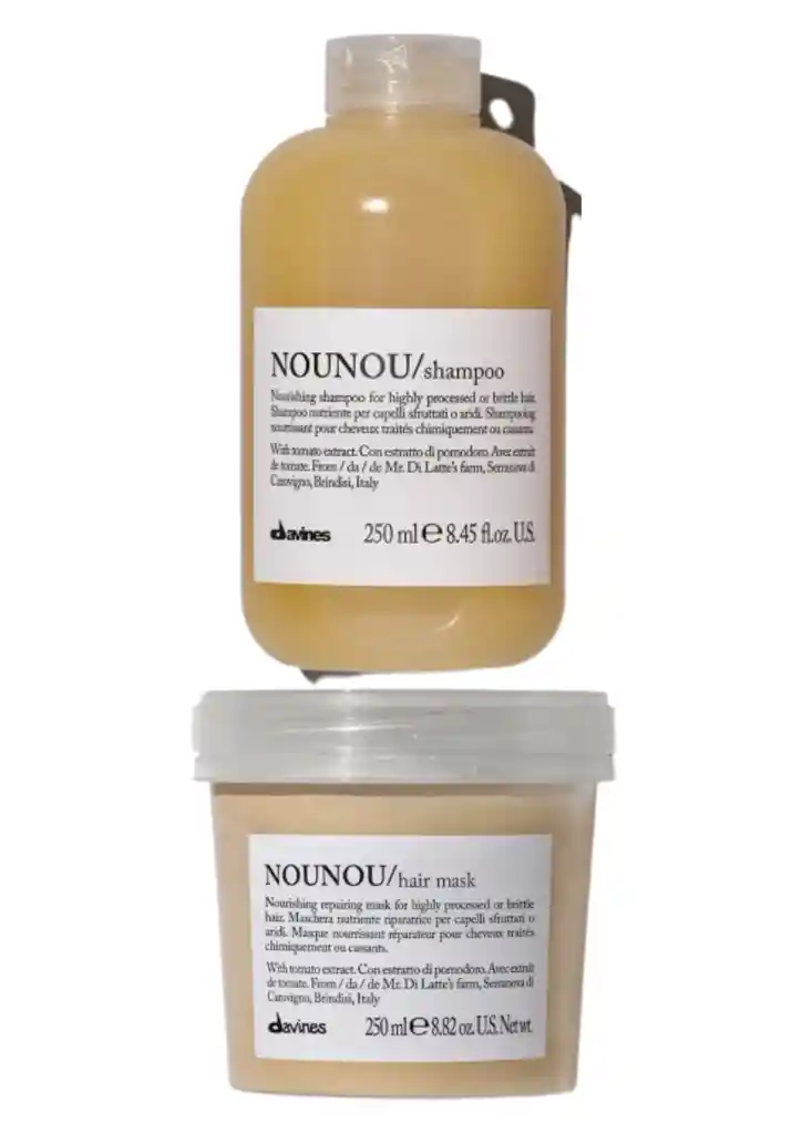 mask 250ml: Mascarilla ideal para cabello maltratado por procesos químicos como: decoloración, permanentes o alisados. Su fórmula resulta indicada para nutrir, hidratar y desenredar el cabello sensibilizado, dejándolo suave, sedoso y brindándole cuerpo sin apelmazarlo. shampoo 250ml: Champú para cabello maltratado por procesos químicos como: decoloración, permanentes o alisados. La fórmula de NOUNOU limpia delicadamente el cabello sensibilizado, brindándole profunda nutrición, hidratación y devolviendo una suavidad excepcional.