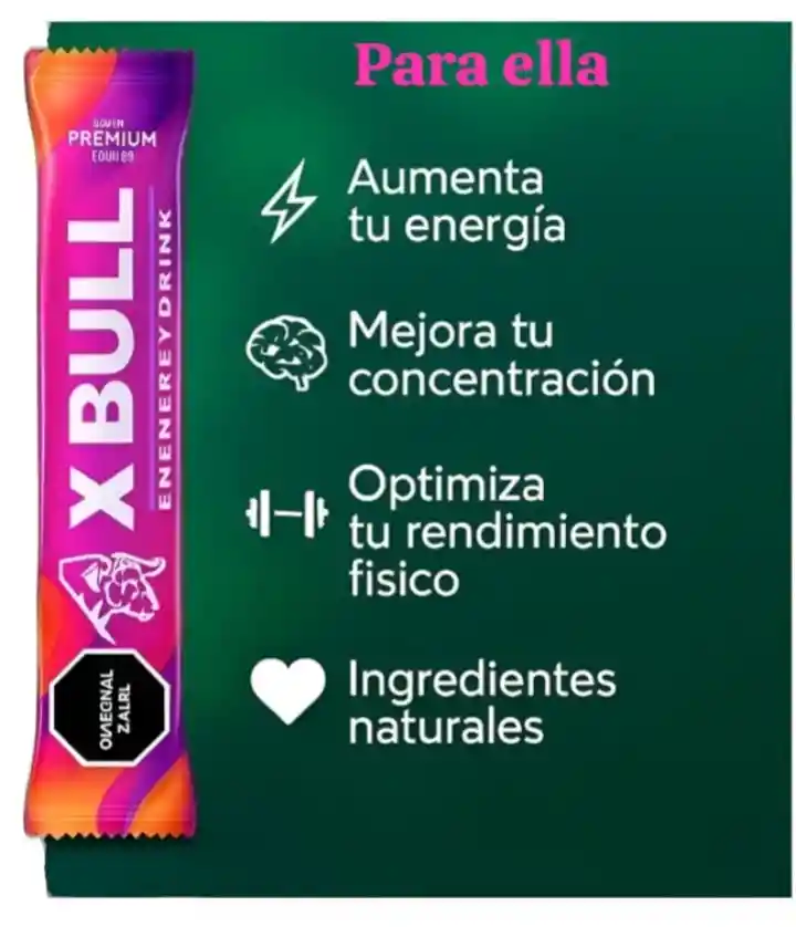 Lleva tu energía al siguiente nivel! XBULL Energy Drink es el suplemento ideal diseñado para potenciar tu rendimiento cuando más lo necesitas. Disponible en versiones específicas para necesidades masculinas y femeninas. Beneficios Clave: Energía Instantánea: Ideal para momentos de alta exigencia física o mental. Fórmulas Especializadas: Versión "Para Hombres" (empaque negro) y "Para Mujeres" (empaque rosa) para un efecto optimizado. Presentación Práctica: Sachet individual fácil de llevar y consumir en cualquier lugar. Sabor Intenso: Contiene edulcorantes para un gusto agradable sin azúcar añadida.