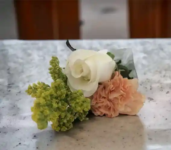 Rosa blanca o roja (según disponibilidad) tipo exportación y 1 clavel, 30 cm de largo, incluye decoración y tarjeta (indicar en el chat que mensaje desea)