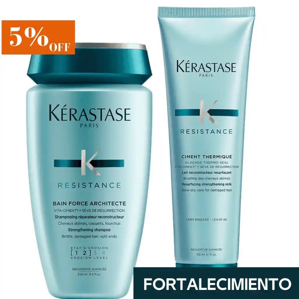 (Shampoo + Termico Architecte) Kérastase Résistance reconstruye la estructura interna del cabello debilitado propenso a roturas y puntas abiertas. Refuerza, cura y desarrolla un cabello fuerte desde la raíz hasta la punta.