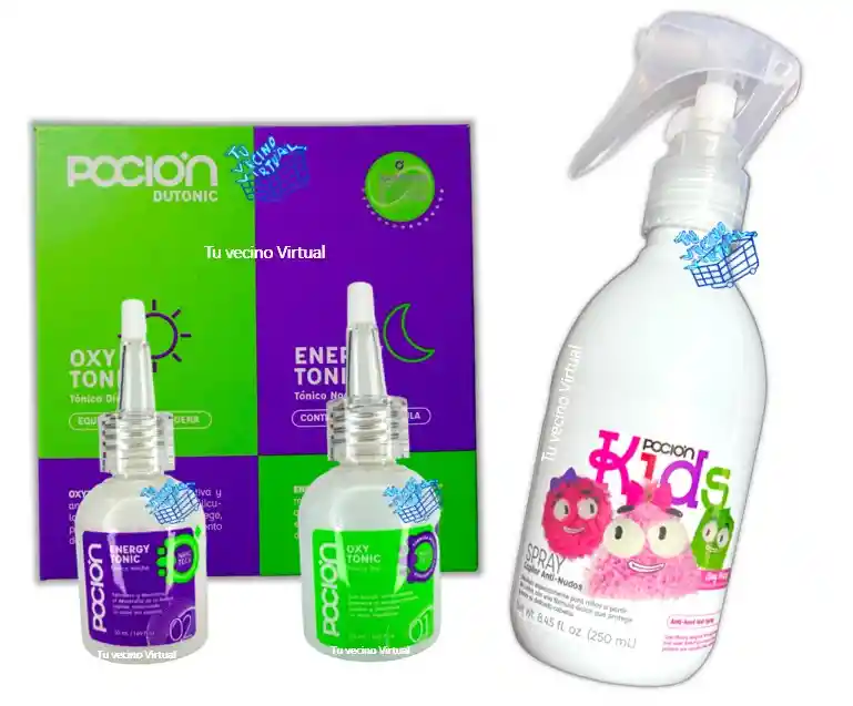 En tu vecino virtual también encontraras : Anyeluz, syam cosmetic, piel de oro, Kaba, class gold, lampiña, Te verde de matcha Benefit, te plus, te latte, te negro, exfoliante, aceite de coco, pomada alfa, colageno hidrolizado,vinipel osmótico, Bioaqua Acne, Mascarillas,tónico, Trendy, la pocion, HGW y muchos mas ————————————————————————————————————————————————— ------------------------------------------------------------------------------------------------------------------------------ DUTONIC – KIT ANTICAÍDA Y CRECIMIENTO CAPILAR DUTONIC es un tratamiento con nanotecnología liposomal, capaz de transportar y liberar eficientemente sus ingredientes en la zona afectada. Sus activos y extractos naturales brindan cohesión y fuerza en el desarrollo de las hebras capilares. Su ritual de aplicación día y noche crean la rutina perfecta para dar solución a la caída del cabello y al mismo tiempo acelera el proceso de crecimiento del cabello DUTONIC densifica las hebras capilares mediante una correcta oxigenación sanguínea, a la vez que estimula la microcirculación en los folículos pilosos y, acelera el nacimiento de nuevos cabellos, extendiendo la fase anágena. Contiene OXYTONIC para aplicar al iniciar tu rutina diurna y ENERGYTONIC en tu rutina nocturna. Contenido : 50 mL - ud. INVIMA: NSOC13407-22CO ———————————————————————————————————— SPRAY Capilar Anti-Nudos Diseñado especialmente para niños a partir de dos años con una fórmula única que protege y nutre su delicado cabello. El cuidado perfecto para un cabello suave, fuerte y libre de enredos. Spray capilar Kids Anti-nudos sin enjuague proporciona un desenredo fácil y sin tirones, evitando la rotura y protegiendo la fibra capilar. Su fórmula ligera fortalece el cabello, dejándolo manejable, brillante y protegido en cada aplicación. Modo de uso: Después de usar el champú y acondicionador Poción Kids, atomiza sobre el cabello húmedo y luego peina para distribuir el producto. No requiere enjuague." Extracto del fruto de coco, que contiene una emulsión de ácidos grasos, proteínas, vitaminas y azucares.